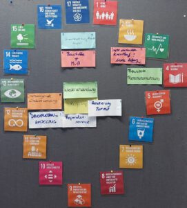 Beide Prinzipien – Nachhaltigkeit und zirkuläre Wertschöpfung – haben stoffwirtschaftlich das Ziel, Ressourcen effizienter zu nutzen und die Umweltbelastung zu reduzieren. Im Workshop ging es zu Beginn darum, die Verbindung zwischen beiden Prinzipien herzustellen. Besprochen wurden eigene Zugänge und bisherige Erfahrungen mit zirkulären Prozessen im Unternehmen in Verbindung mit den 17 Nachhaltigkeitszielen der UN (SDGs).